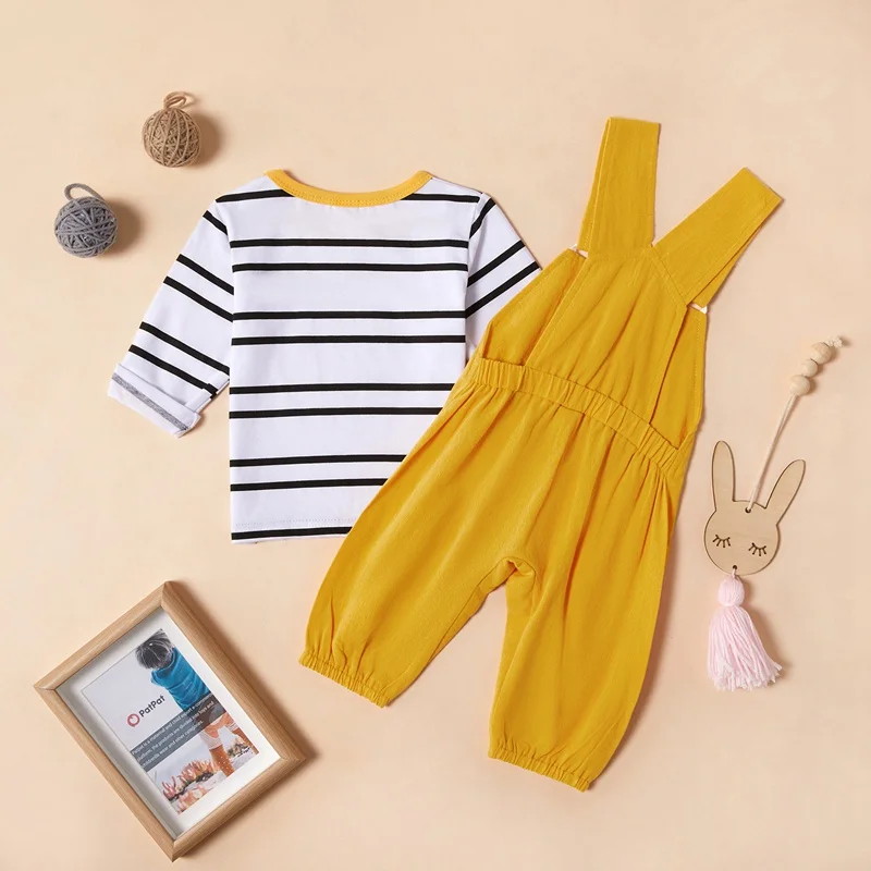 BEST QUALITY New Children Spring Autumn Striped Cartoon Stripe Print Short Sleeve Blouse Casual Tops+Bib Pants 2